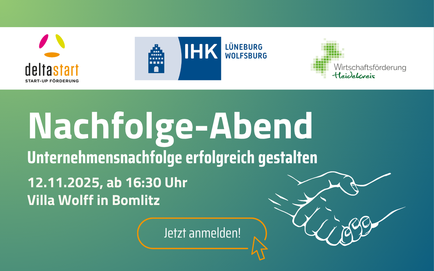 Wie gelingt eine Unternehmensnachfolge – fachlich, organisatorisch und menschlich? Antworten auf diese Fragen gibt es am Mittwoch, 12. November 2025, in der Villa Wolff in Bomlitz. Ab 16:30 Uhr laden wir gemeinsam mit der IHK Lüneburg-Wolfsburg und der Wirtschaftsförderung Heidekreis zu einem kostenlosen Abend rund um das Thema Unternehmensnachfolge ein.